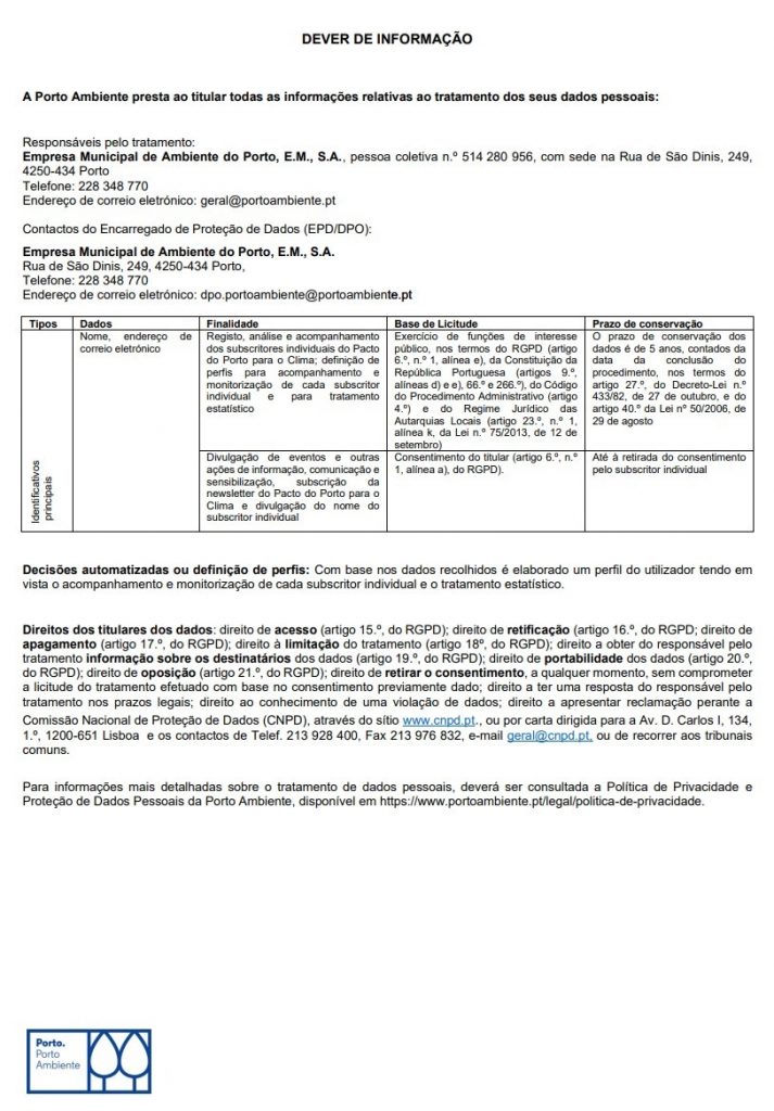 Neste contexto, a Porto Ambiente necessita de recolher dados pessoais por forma a analisar e acompanhar o processo de subscrição individual ao Pacto do Porto para o Clima, designadamente: